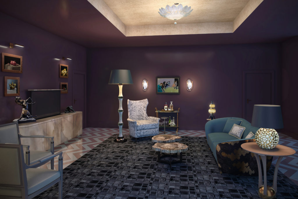 The client insisted on a living space that would rival any tony, upper east side Manhattan apartment. With direct access to the pool and gardens via iron french doors, this space embraces the Mediterranean lifestyle with sumptuous surroundings that flow easily from inside to outside. The backdrop for this room is enveloping — a lacquered aubergine wall treatment, an important Murano chandelier acting as a focal point, and painted wood floors in a chevron pattern are soft on bare feet. Every furnishing, fabric, light fixture, and object in this space is unique, creating unending visual interest and enjoyment. Always bespoke and with a sense of place, RavenThorn specified an unusual, cantilevered, hand-carved bronze sofa end table named “Shasta” to reflect the owner’s view of Mount Shasta.After sundown, this parlor becomes a magical jewel box, embodying RavenThorn’s restrained elegance. Impactful bronze sculptures and carefully chosen artwork offer enduring wonderment and curiosity. The eye-catching “Confusion” hide rug by Kyle Bunting juxtaposes effortlessly with the classic Brunschwig & Fils toile fabric on the contemporary wingback lounge chair. Total tranquility awaits.