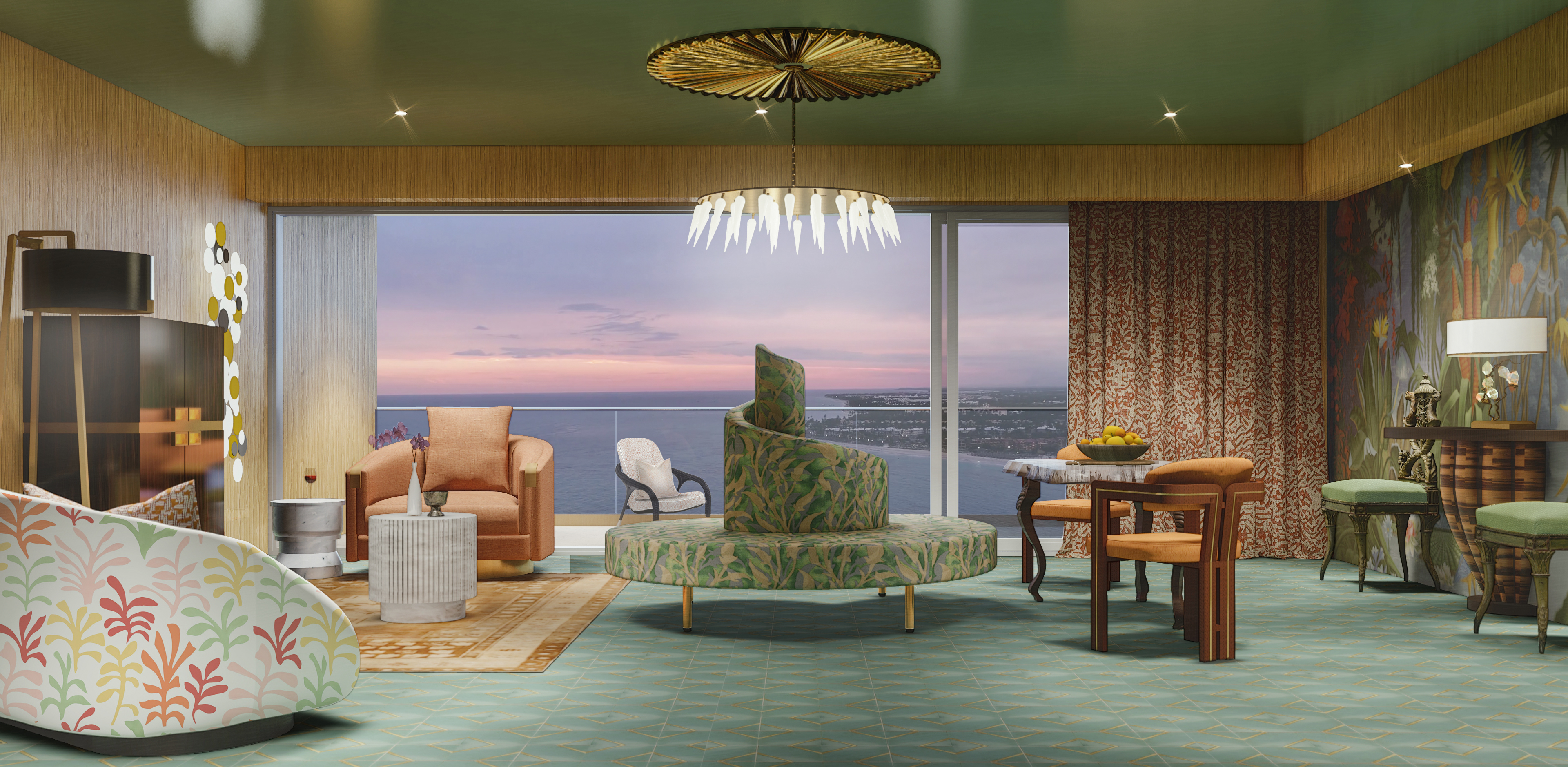 The combination of sophisticated elegance and eclecticism is at the heart of every RavenThorn design. This extraordinary penthouse in the Mar Azul tower, conceived by Four Seasons Punta Mita architect Ramiro Cortes, embraces the indigenous, culturally-inspired warm color palette of Mexico, translated to international levels of luxury. The space is flanked by unique, one-of-kind wall elements created by a pair of Colombian artists — a whimsical mirror from Chris Wolston and a biophilic, plant-based sculpture by Alejandra Aristizabal. Ultimate tropical comfort melds with cosmopolitan flare. • Wood floor tiles (Mirth Studio) • Chandelier (Ngala Trading) • Dining banquette (Unique Design) • Dining chairs (Overgaard & Dyrman) • Dining table (Randolph & Hein) • Chaise (Anees Upholstery) • Occasional chair (Alfonso Marina) • TV cabinet (Baker) • Hammock (Aqua) • Cocktail table (Wendell Castle) • Balcony seating (Shore) • Mirror (Chris Wolston) • Wall sculpture (Alejandra Aristizabal) • Sconce (Gregorious Pineo)
